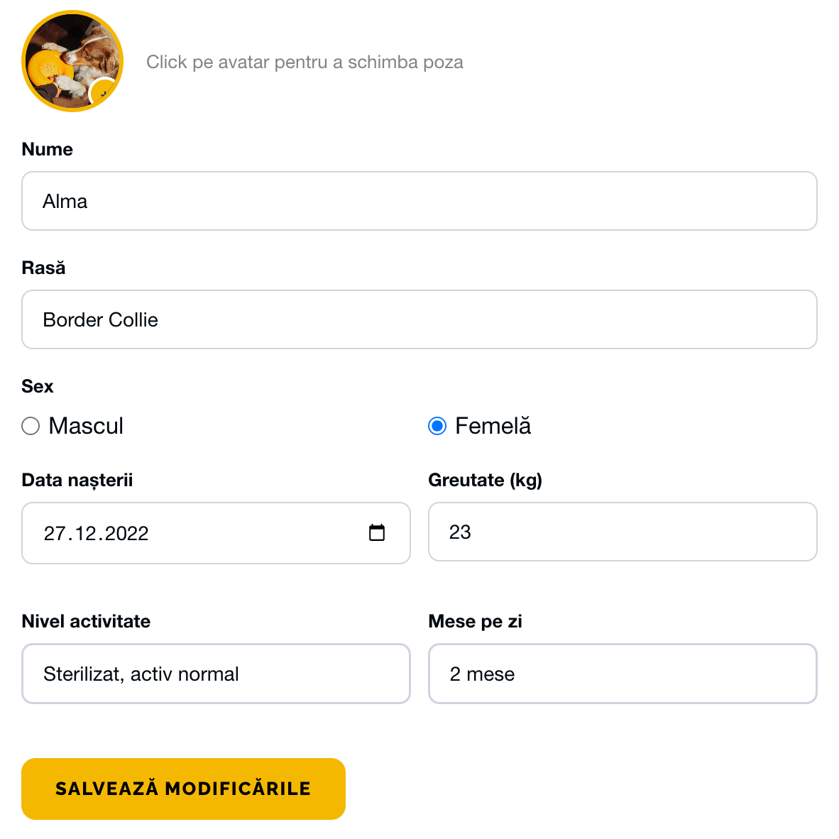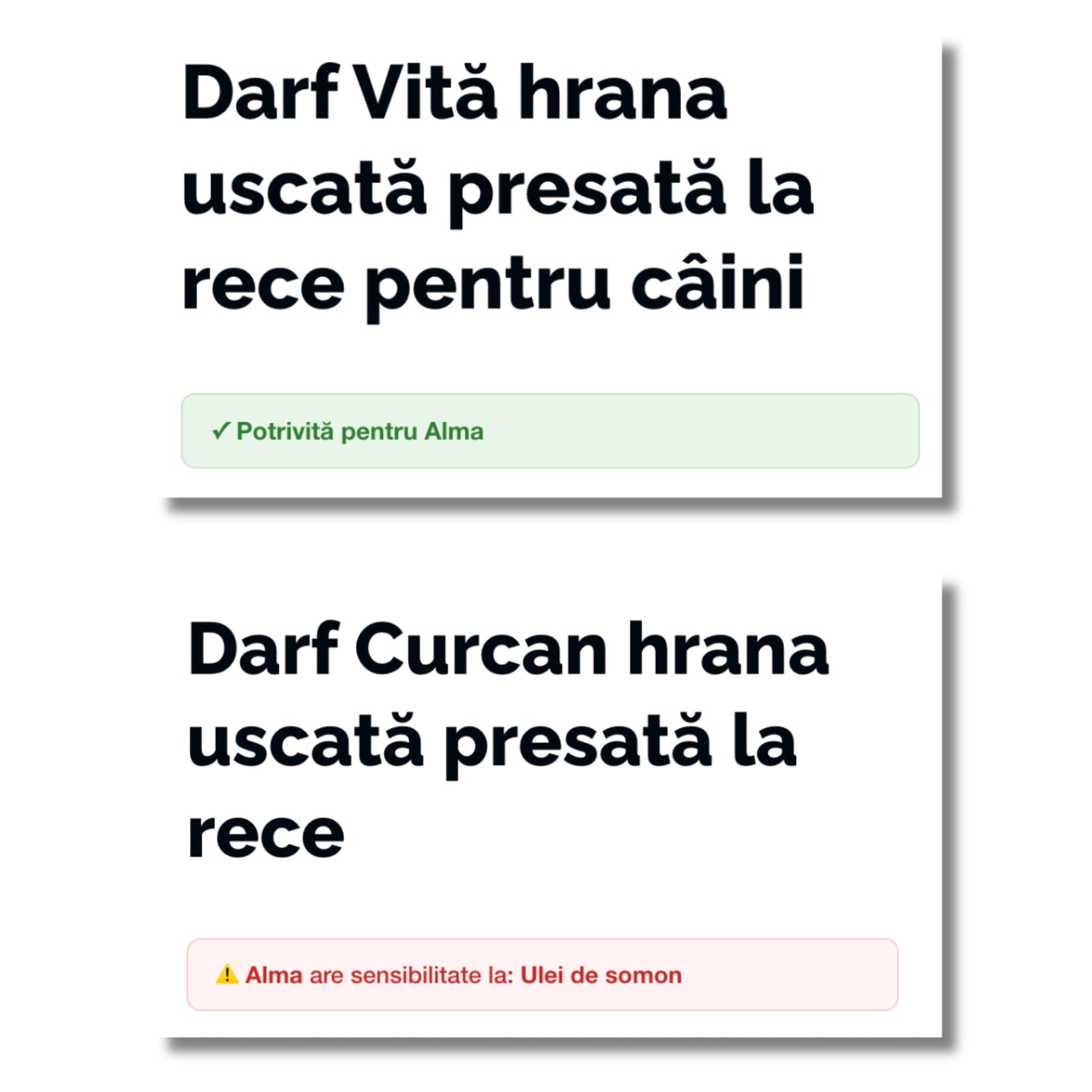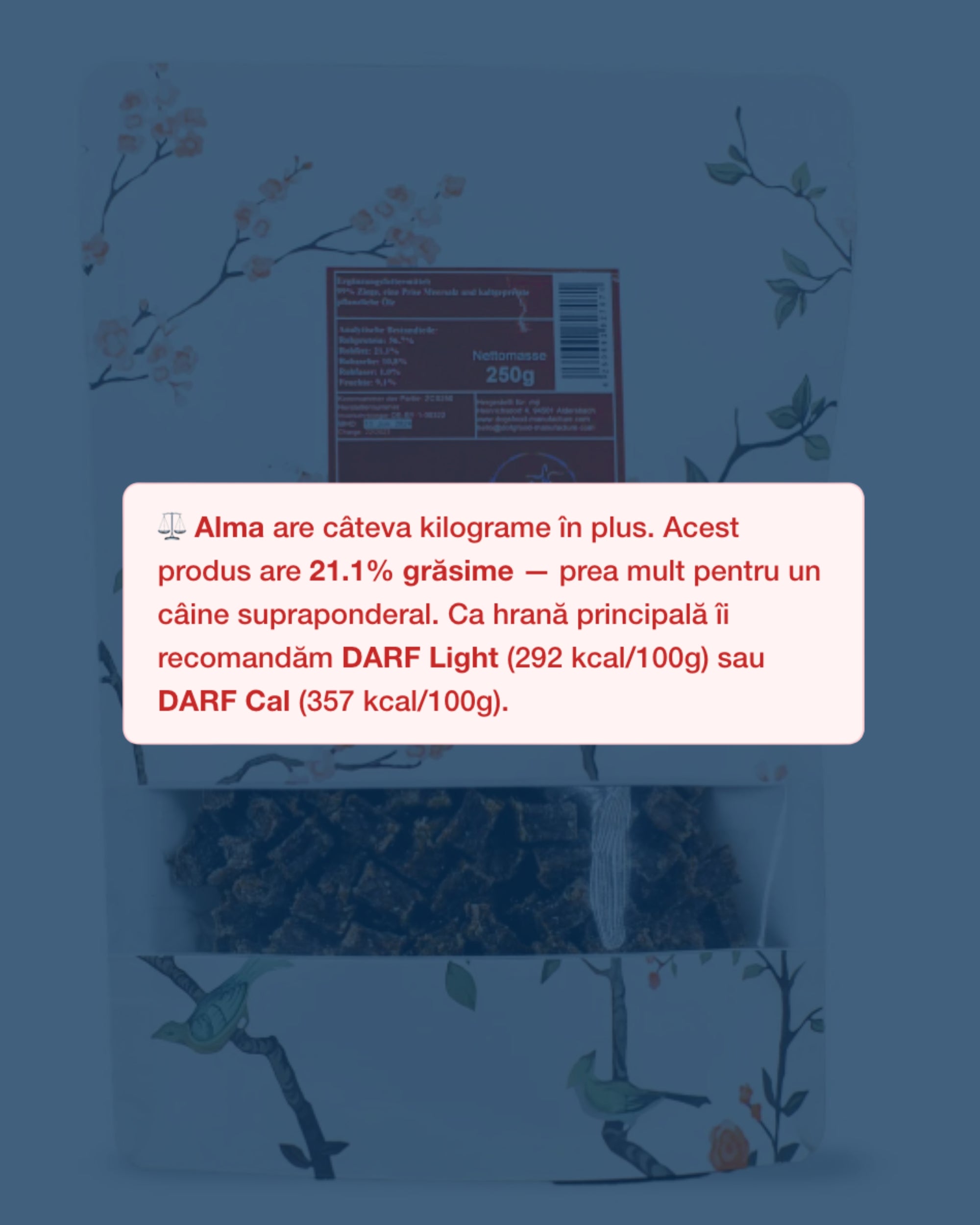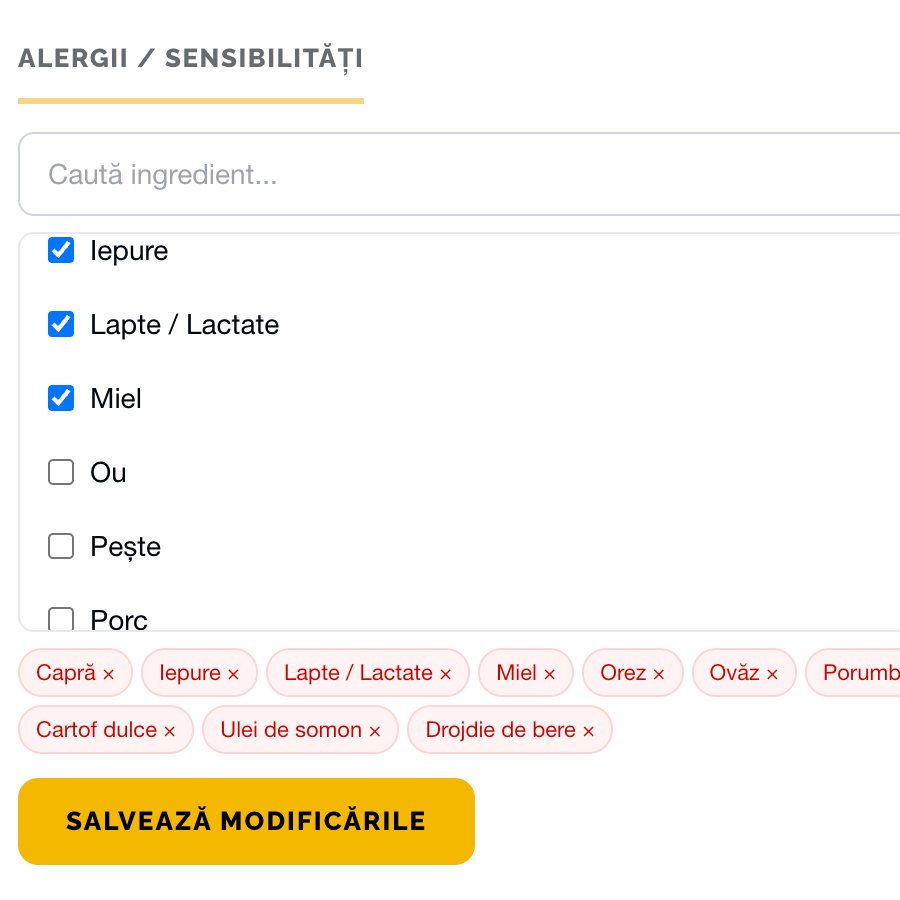 Pentru câinii care trebuie să își gestioneze greutatea, fiecare produs este evaluat în funcție de aportul caloric și conținutul de grăsimi. Setezi că este supraponderal, iar sistemul îți arată imediat diferența dintre produsele mai calorice și cele potrivite pentru echilibru.